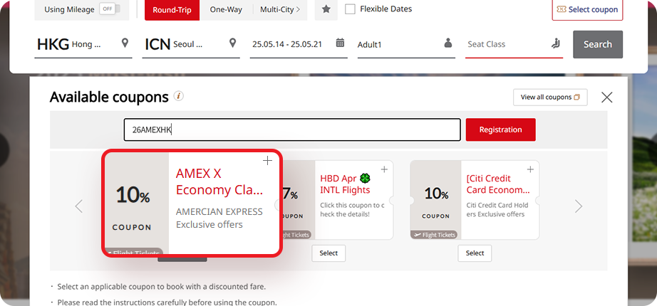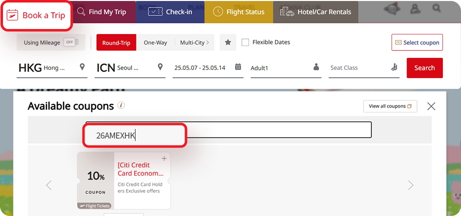 Select your applicable flights and enter the Promo Code "26AMEXHK"
