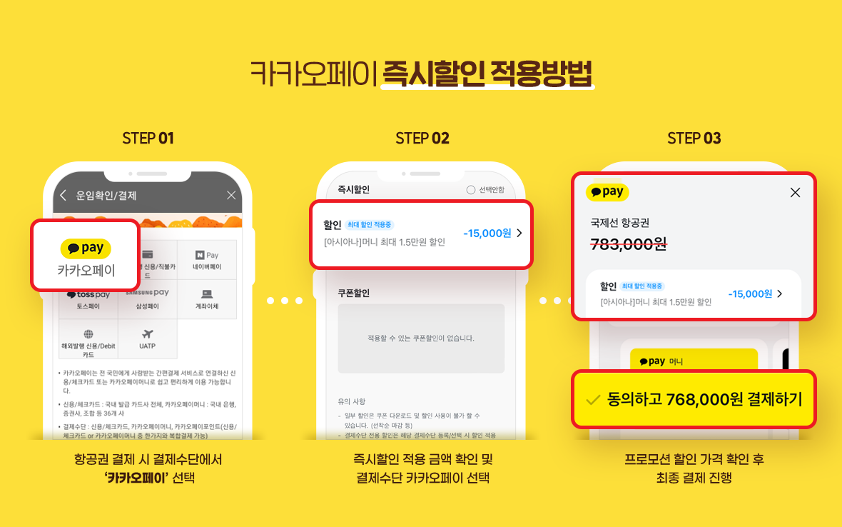 • 할인 적용금액은 카카오페이 결제창 내 ‘할인’ 및 상세 보기를 통해 확인 가능합니다.