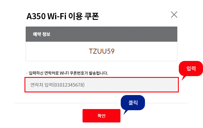 • Wi-Fi 쿠폰은 예약 된 인원 수 만큼 쿠폰 발송 가능합니다. (다인원 예약일 경우, 인원수만큼 예약 조회 하단에 있는 이벤트 배너를 클릭하여 추가 발송 부탁드립니다.)